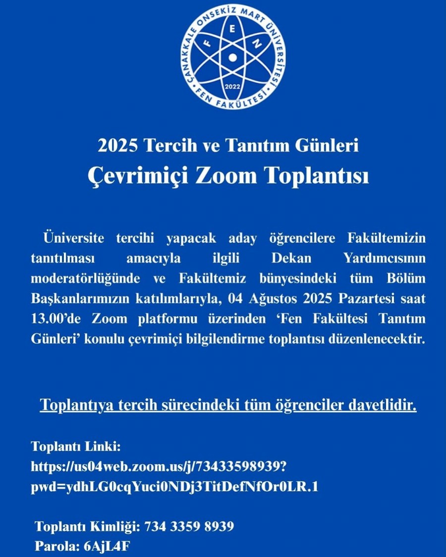 Üniversite tercihi yapacak aday öğrencilere Fakültemizin tanıtılması maksadıyla İlgili dekan yardımcısının moderatörlüğünde ve Fakültemiz bünyesindeki tüm bölüm başkanlarının katılımıyla, 04 Ağustos 2025 Pazartesi saat 13.00’de Zoom platformu üzerinden ‘Fen Fakültesi Tanıtım Günleri’ konulu çevrimiçi bilgilendirme toplantısı düzenlenecektir. Toplantıya tercih sürecindeki tüm öğrenciler davetlidir.