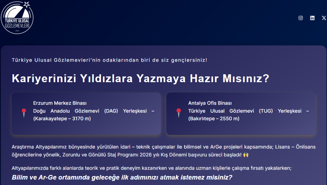 Türkiye Ulusal Gözlemevleri Staj Duyurusu
